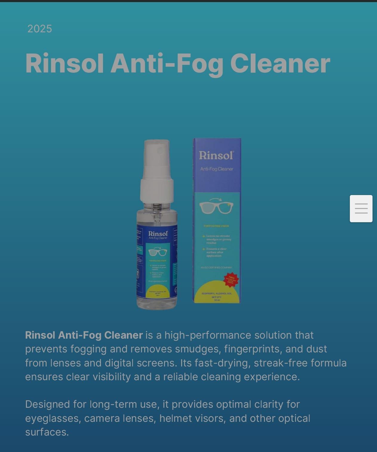 Rinsol Anti-Fog Cleaner is a high-performance solution that prevents fogging while removing smudges, fingerprints, and dust from lenses and digital screens. Its fast-drying, streak-free formula delivers crystal-clear visibility and a reliable cleaning experience.